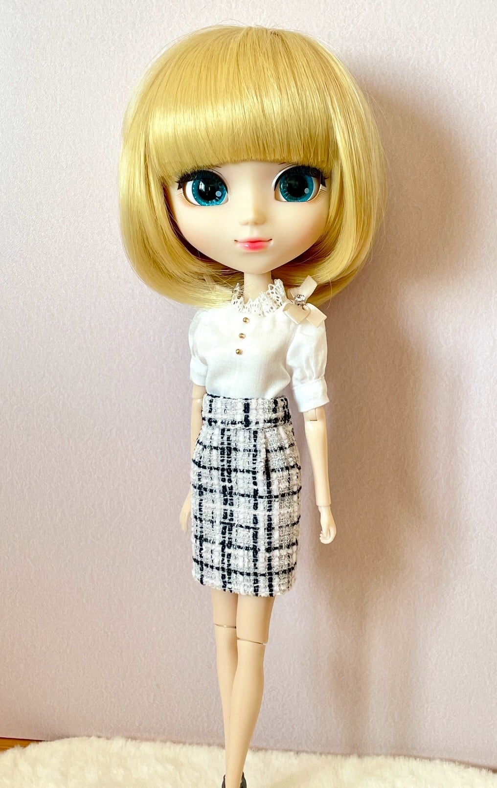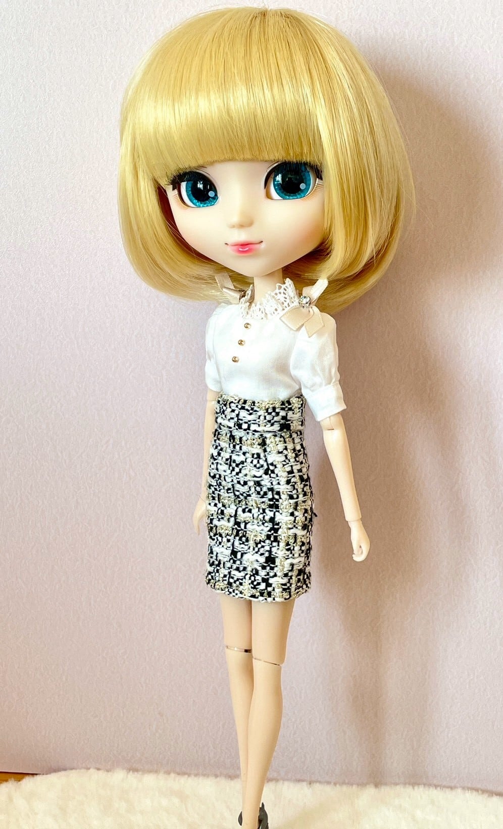肩のリボンが可愛いシンプルな形のブラウスと、ツイード生地で作ったタイトスカートの2点セットです。